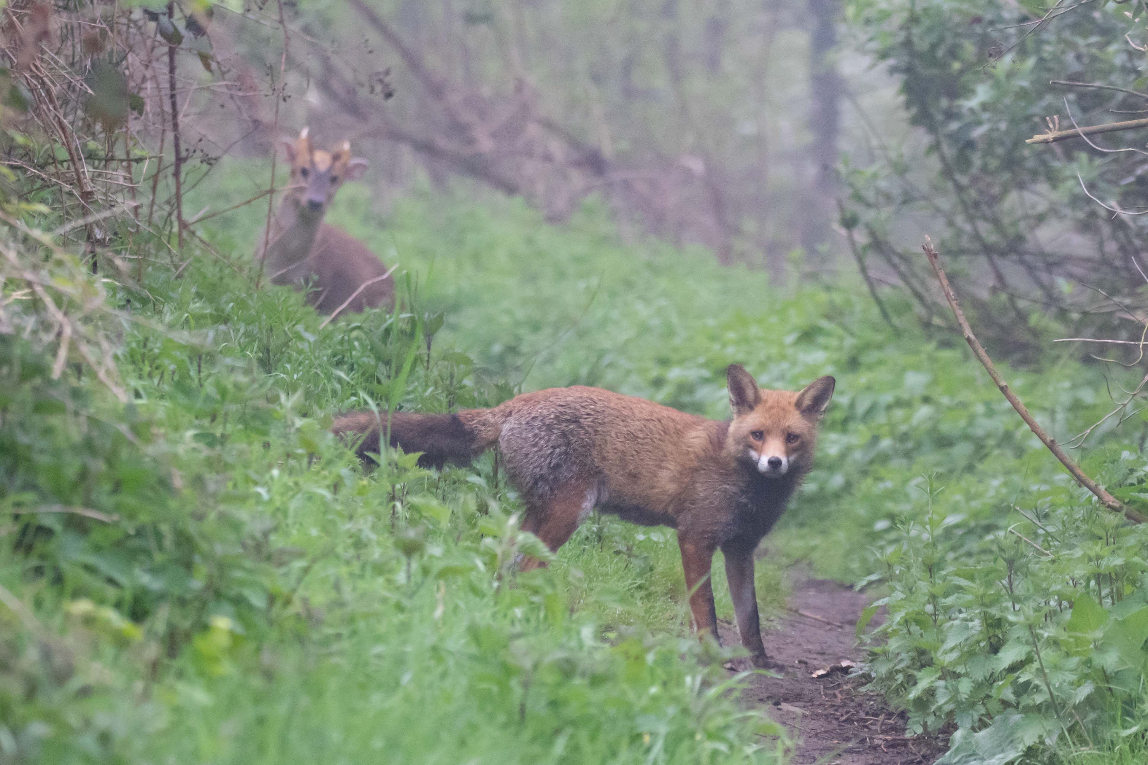 Male Muntjac and Red Fox, Boundary Brook Valley