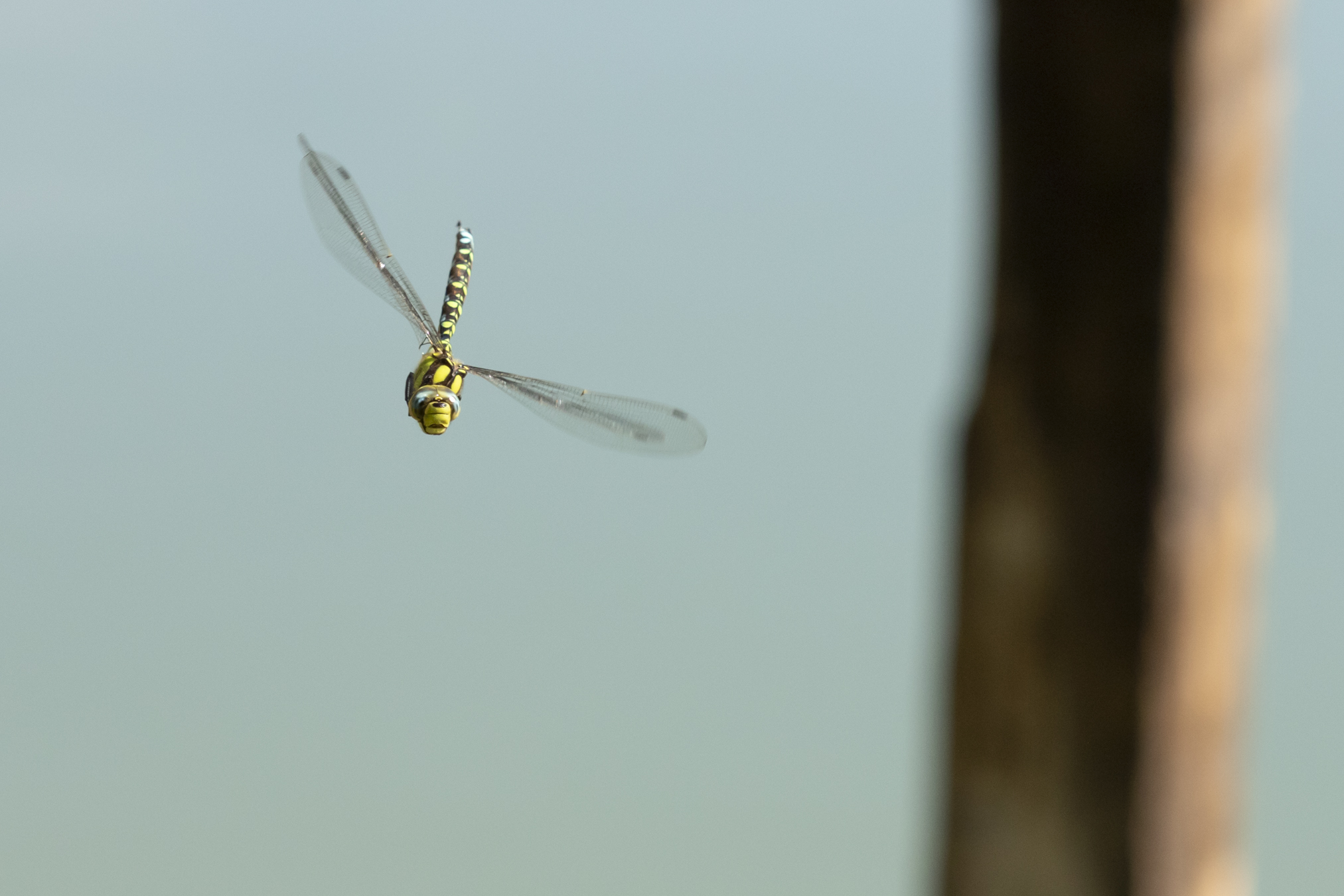Much better! I was pleased that this flying insect was pretty much in focus, with even most of the wing motion frozen by the fast shutter speed. I realised I could clearly make out the incredible eyes that wrap around the huge mouthparts at the front of the head. Dragonflies are virtually deaf and have a poor sense of smell. The vast majority of the information about their surroundings comes from their eyes. Being able to fly very fast, requires superb vision and balance. Otherwise, it ends very badly.