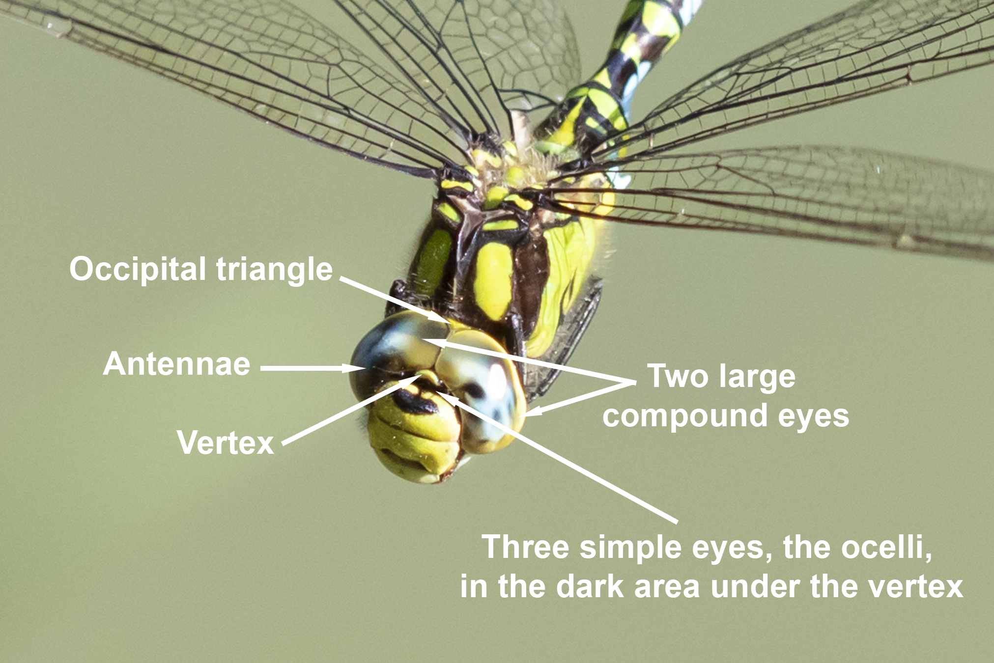 Being able to see such detail in the photographs made me want to understand what some of these structures were. Ray Cannon has published some excellent blog posts about dragonfly anatomy in general and dragonfly vision in particular. My first discovery was that dragonflies have at least five eyes: two obvious large compound eyes, that wrap around the side of the head, but also three simple eyes tucked in under the vertex, the ocelli. Common to many ancient insects, the ocelli have a role in keeping the insect orientated in space and level in flight. Combined with the two large compound eyes, the position of these five eyes gives dragonflies nearly a 360-degree visual field, they really can see what’s behind them!
