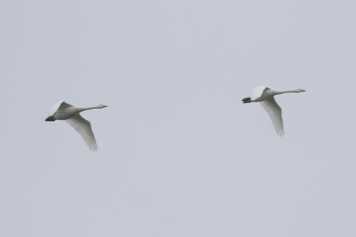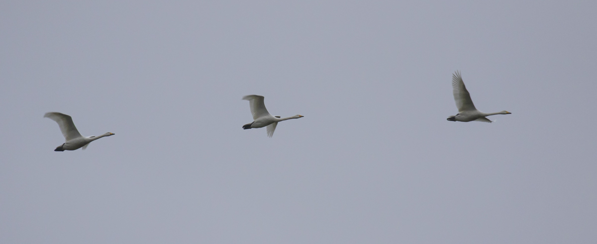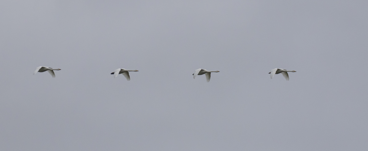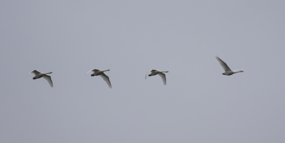 Then I heard more calls. Simultaneously, as the thought “Whooper Swans?” formed in my mind, my jaw began to drop. Seconds later, four huge, gleaming white swans broke the skyline, their calls echoing over the golf course. It was true, I was in the presence of Whoopers:
