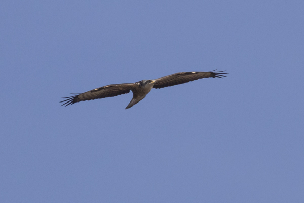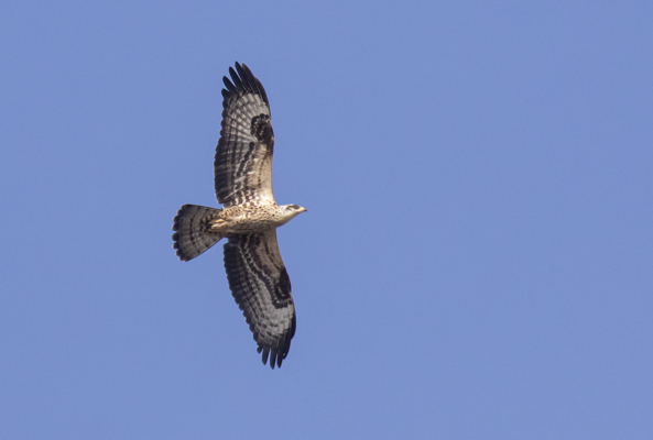 The long head and neck stand out, as do the long tail and bulging secondaries. We eventually had a close approach from this gorgeous pale juvenile Honey Buzzard: