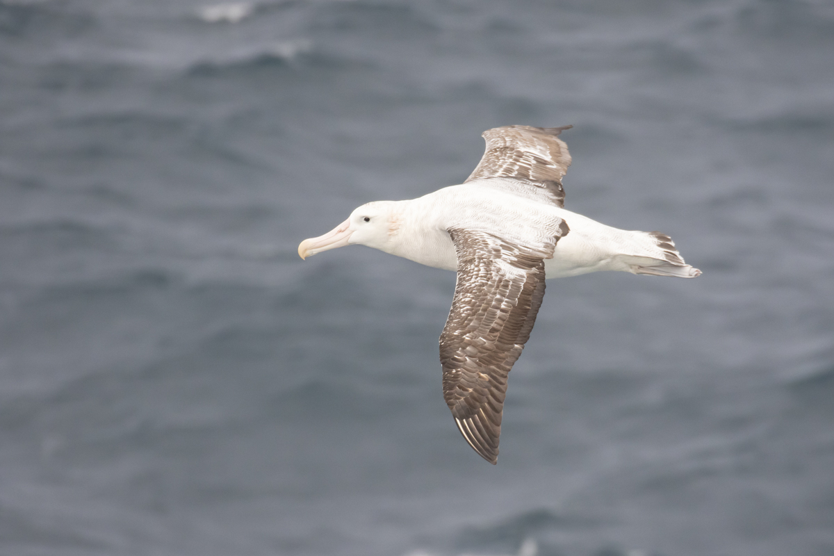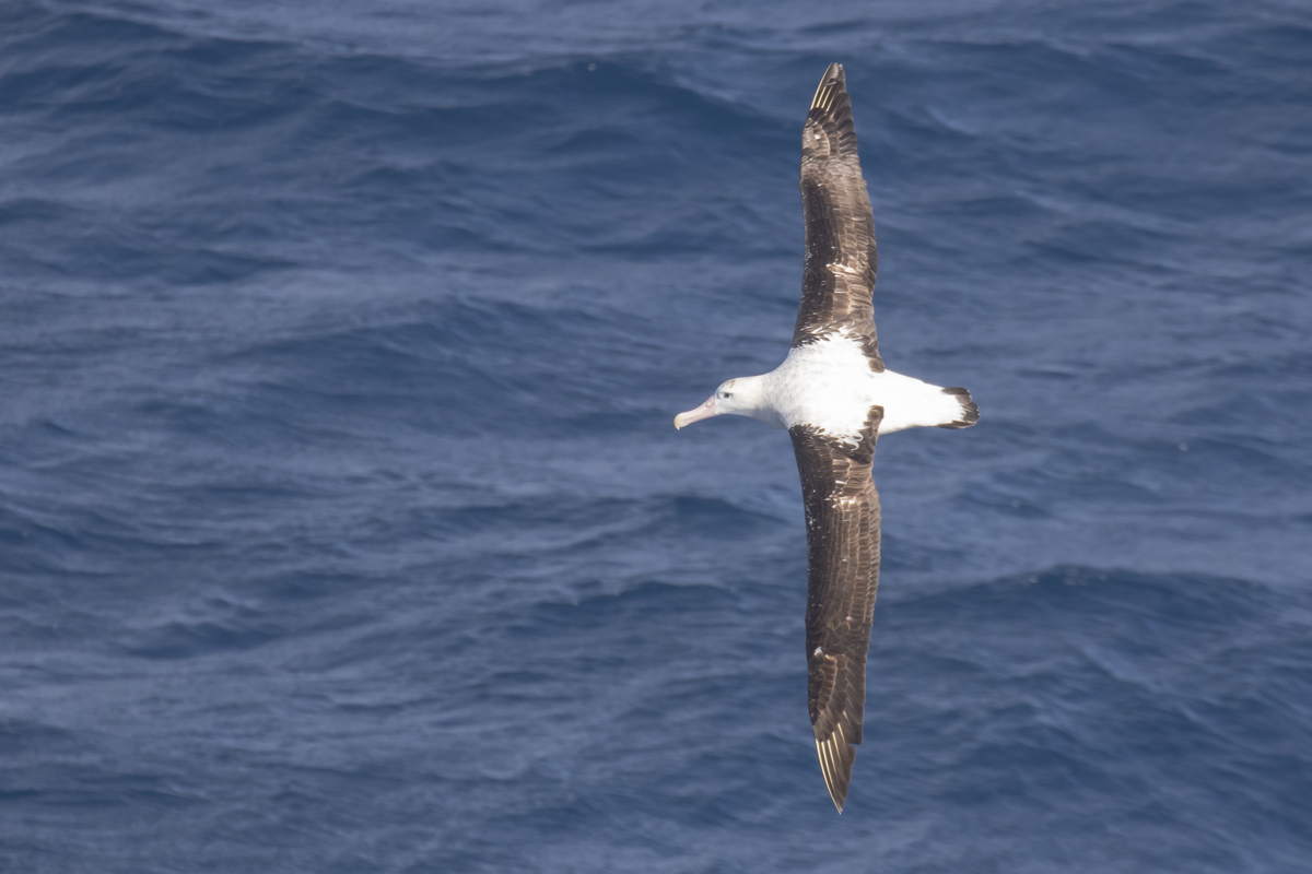 We knew that the only other realistic option was that the bird was a Tristan Albatross and that Peter Harrison has devoted much time to distinguishing these two species in the field. According to Harrison’s own work (Seabirds: the new identification guide, 2021) only male Tristan Albatrosses of a certain age can be separated from Snowy Albatrosses. These birds have uniformly dark wings, especially the forewing, with distinct white elbow patches in the mid-wing. Ideally there is little black in the tail too. According to Harrison, no Snowy Albatross shows this exact pattern on the wing and tail and these birds can safely be identified as Tristan Albatrosses.