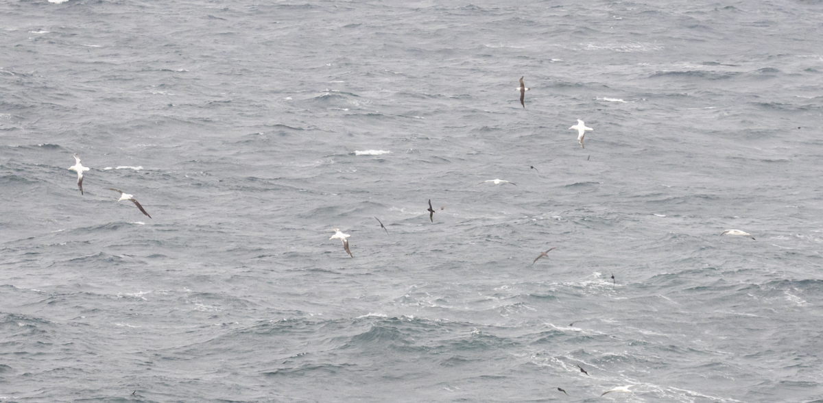 Five Snowy Albatrosses, an Indian Yellow-nosed Albatross (top right), together with Giant Petrels and White-chinned Petrels. There is even a tiny Black-belled Storm Petrel (wingspan 46cm) under the farthest right Snowy Albatross (wingspan up to 3.5 meters)!