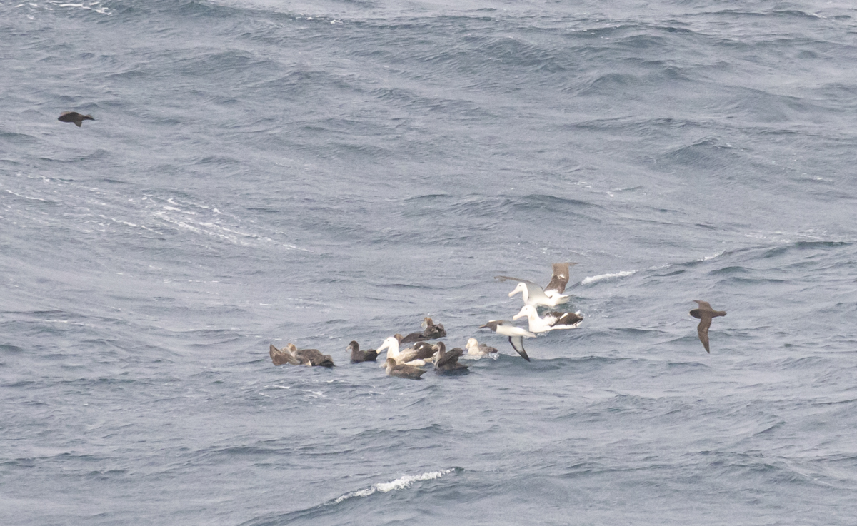 The number of Snowy Albatrosses was astounding These huge birds drifted around, occasionally gathering in groups to fight over food sources: