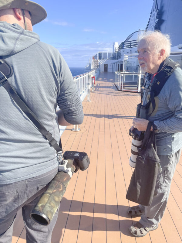 Andy and I stood on deck 14, the top deck, watching a huge Wandering-type albatross performing gentle loops over the sea behind the boat. Suddenly and surprisingly, world famous seabird author Peter Harrison was standing next to us. He said “Check out the albatross following the ship, because from the photographs that I’ve seen I don’t think it’s a Wandering”.