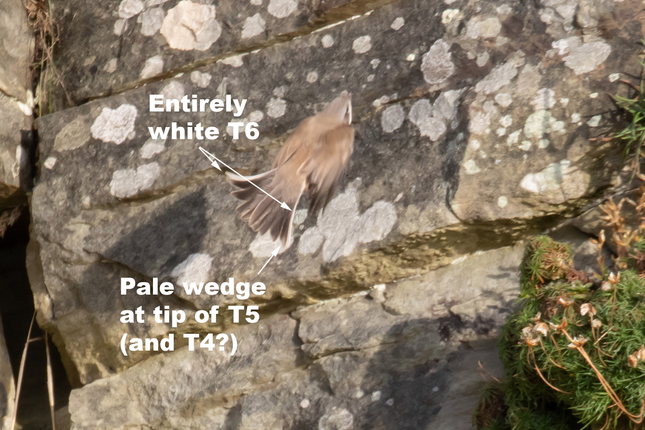 The tail pattern is important and fortunately I managed to get some sort of record of it as the bird darted up to take an insect from near the rock face: