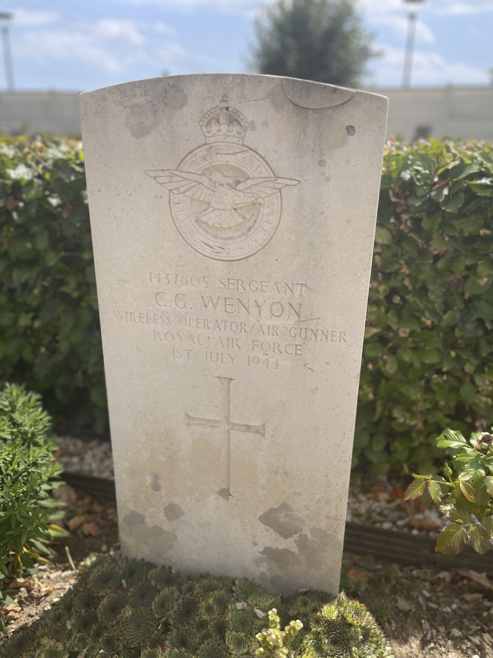 On the way back through central France we visited the grave of Conrad Wenyon, an uncle on my mother’s side of the family. He was a wireless operator in the Royal Air Force, but was killed when his Lancaster was shot down over Bourges in July 1944, as the Allied forces moved through France after D-day. The pilot, Harry Taylor, survived and submitted this report on the loss of the aircraft:
