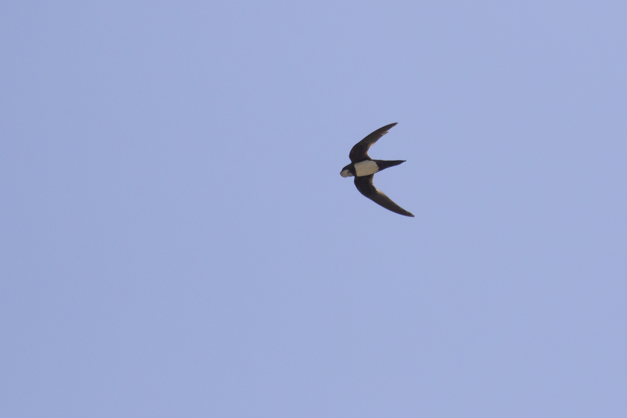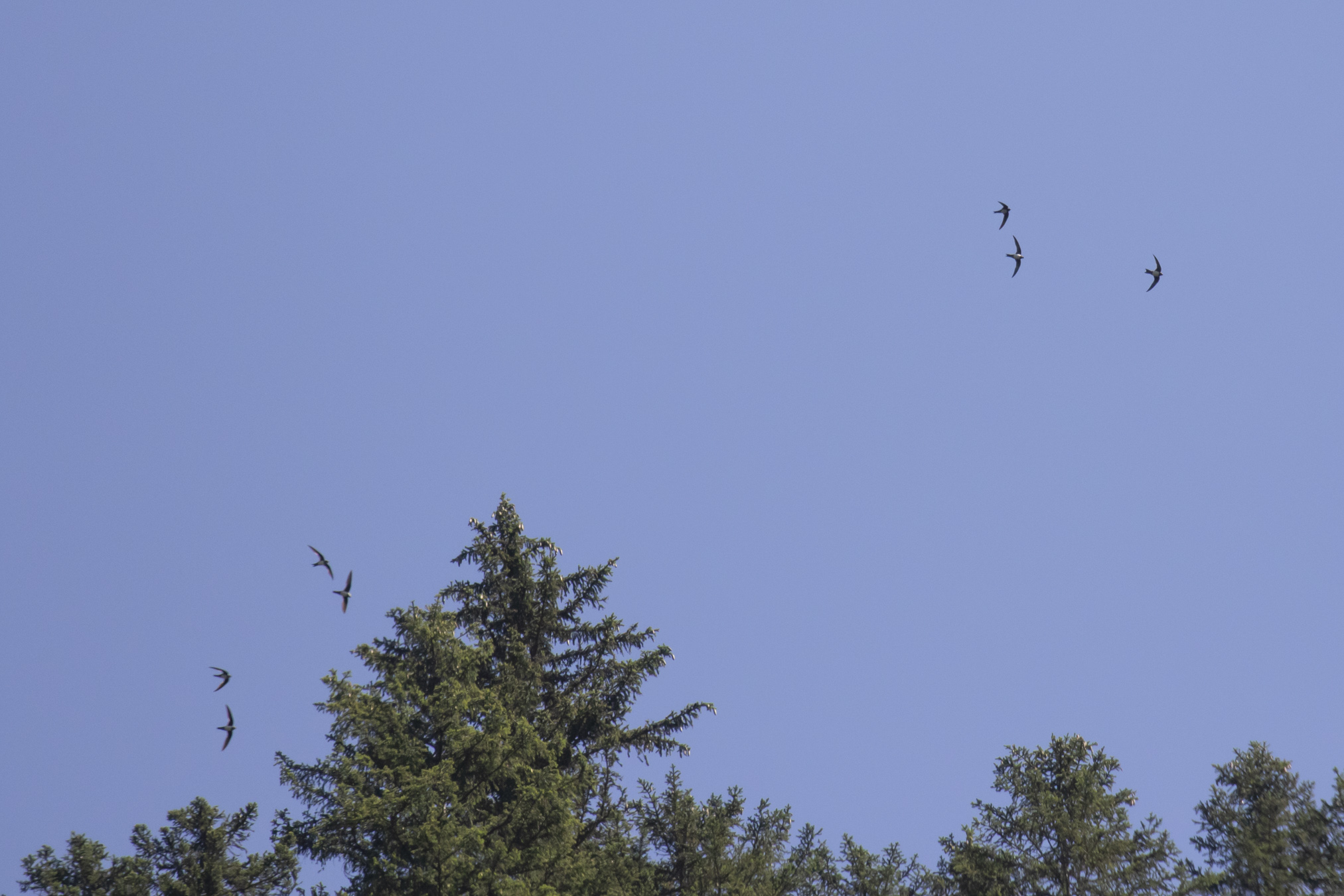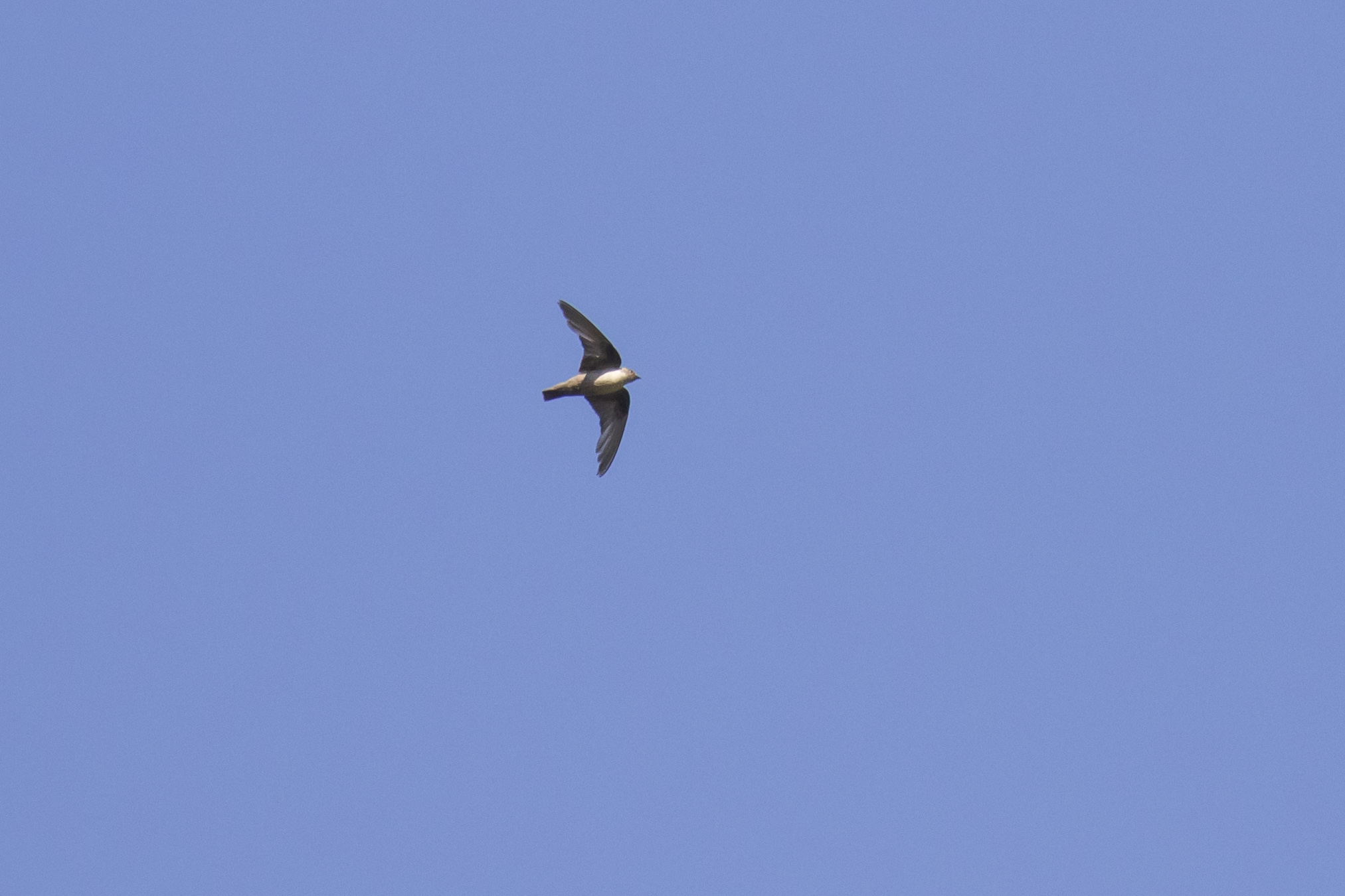 Favouring lower altitudes, a few Crag Martins fed amongst the Alpine Swift flocks: